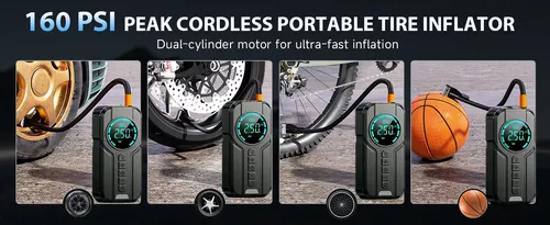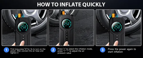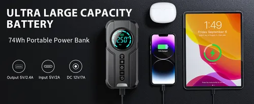 - ➤【Quick Inflation & LCD Screen】Features a clear, easy-to-read LCD display with inflation pressure up to 150 PSI. Includes 4 versatile nozzles perfectly suited for cars, motorcycles, bicycles, and sports equipment. Ready for any tire emergency. Press the light button on the starter to cycle through 3 LED lighting modes (Flashlight/SOS/Strobe), making it ideal for nighttime emergencies. Dual Type-C ports allow charging of mobile devices