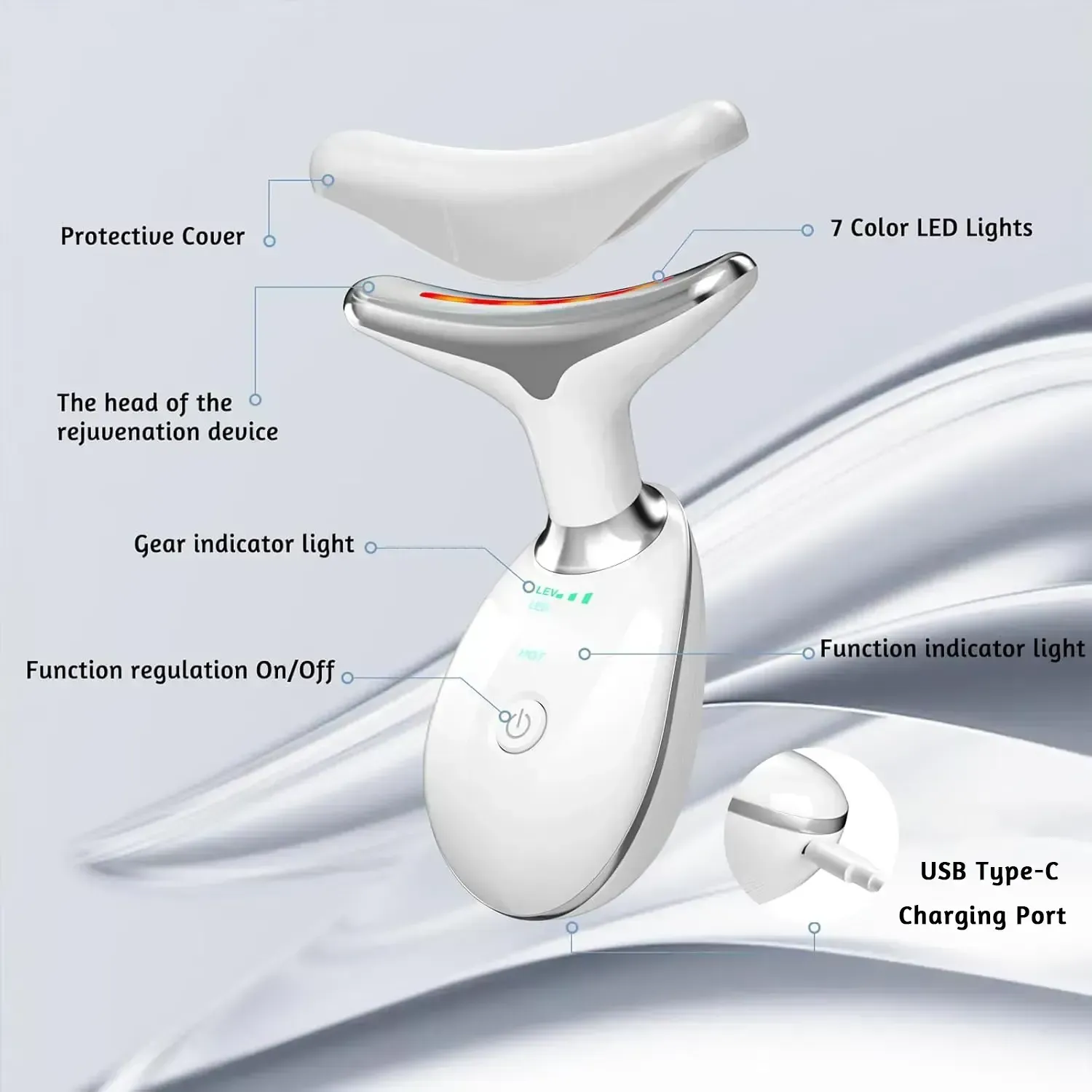 Blue Light:Boost skin surface microcirculation, brighten dull neck skin, and refine rough texture Yellow Light:Even out neck skin tone, reduce dullness and sallowness, reveal natural bright swan neck