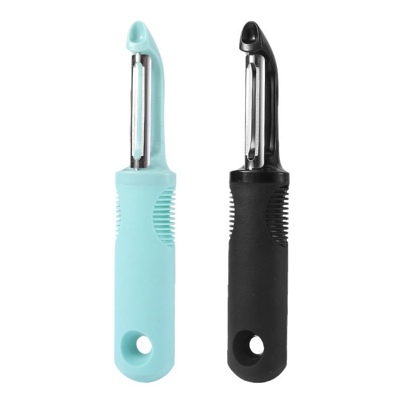 1--Swiveling twin blades with flexible action easily peel potatoes, apples and other tough skinned fruits and vegetables