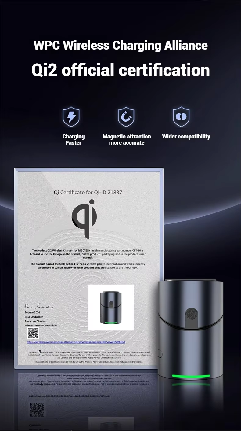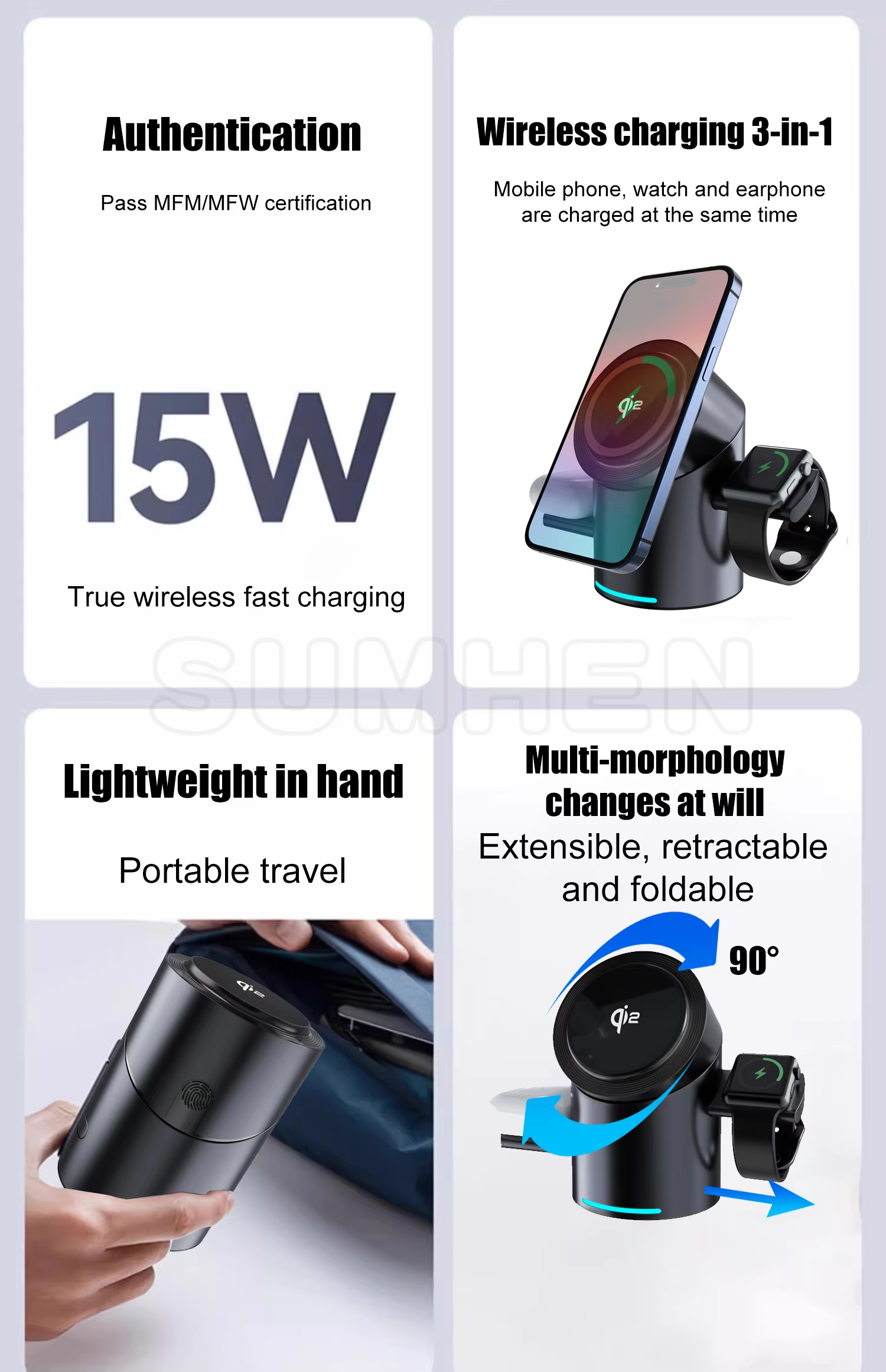 SpecificationitemValueProduct name3 in 1 Magnetic Wireless ChargingProduct modelXZ-01Product interfaceType-CInput parameters5V/3A 9V/3A 12V/2.5AWireless Charger Stand15W/10W/7.5W/5WSmartwatch output2.5WEarphone output2.5WColorBlack/GreyConversion rate≥80%Induction distance<5mmProduct configurationproduct host + 1m Data cable + manual + neutral color packaging boxProduct qualificationQi2/CE/FCC