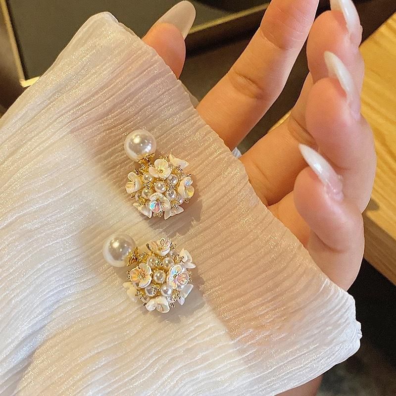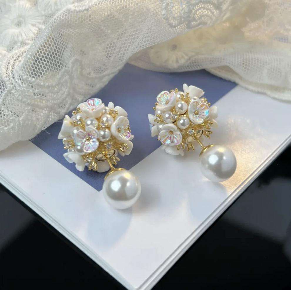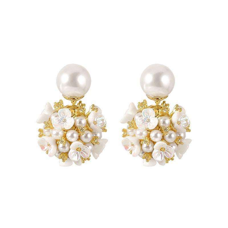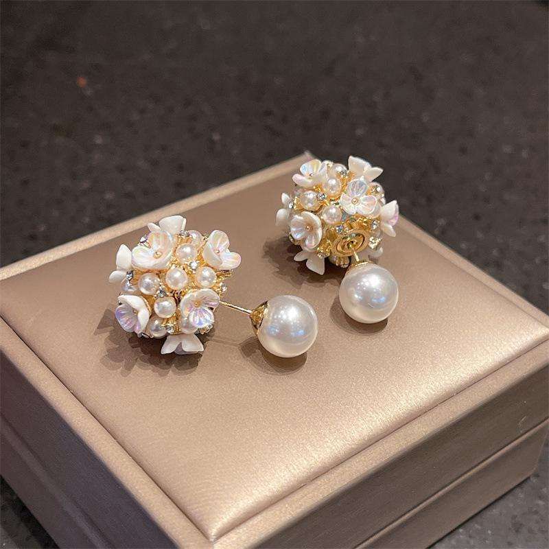 Vintage Elegant Women's Double-Side Floral Stud Earrings, Zinc Alloy with Simulated Pearl & Shell Ball Bezel Luxury Wedding Gift